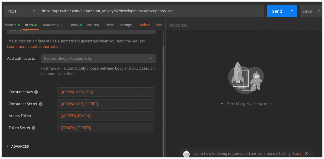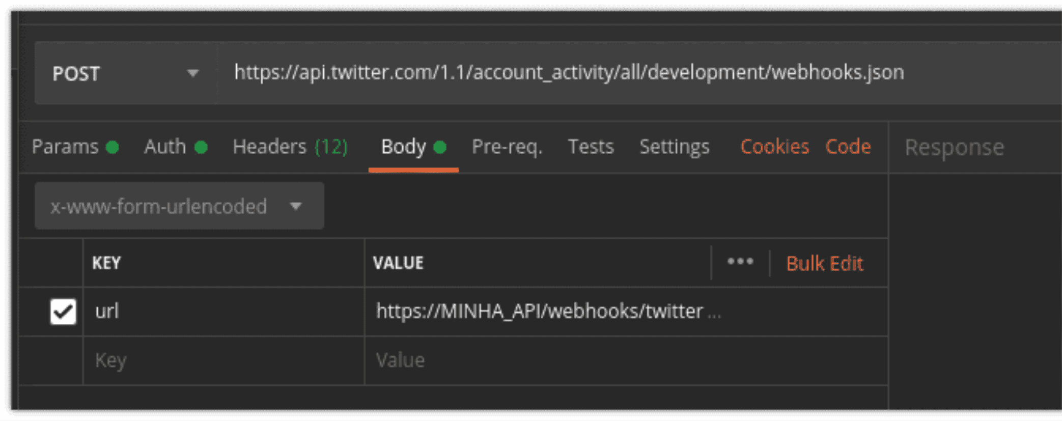 Após o registro do ambiente da Account Activity API o próximo passo foi de fato cadastrar uma API minha de Webhook no Twitter. Cada passo é uma chamada HTTP na API do twitter, sendo assim são dois passos: