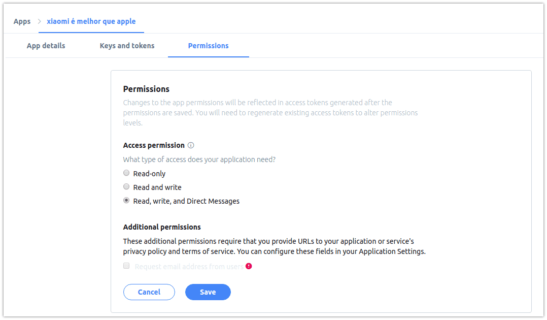 É necessário configurar o APP para ter acesso a Direct Messages do Twitter.