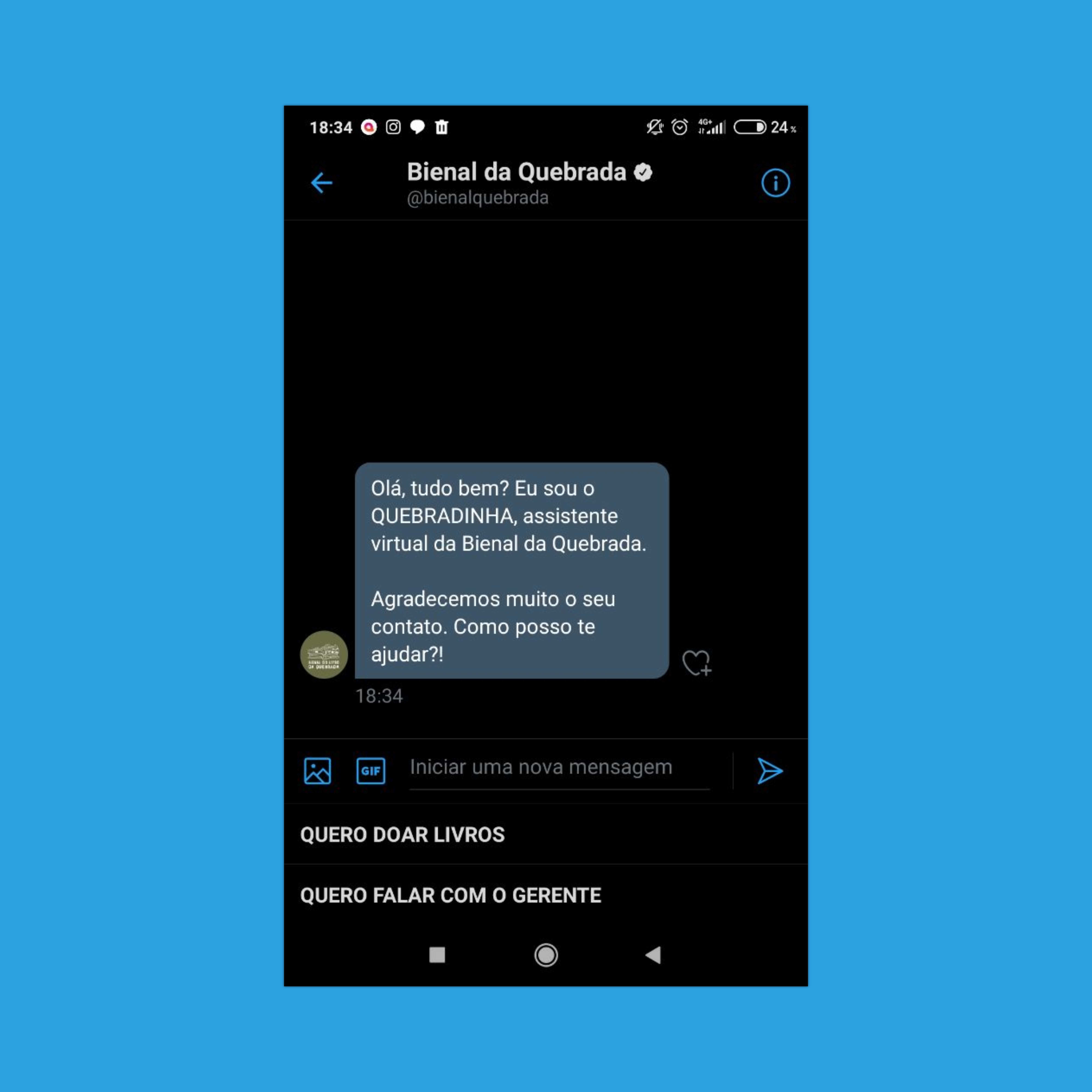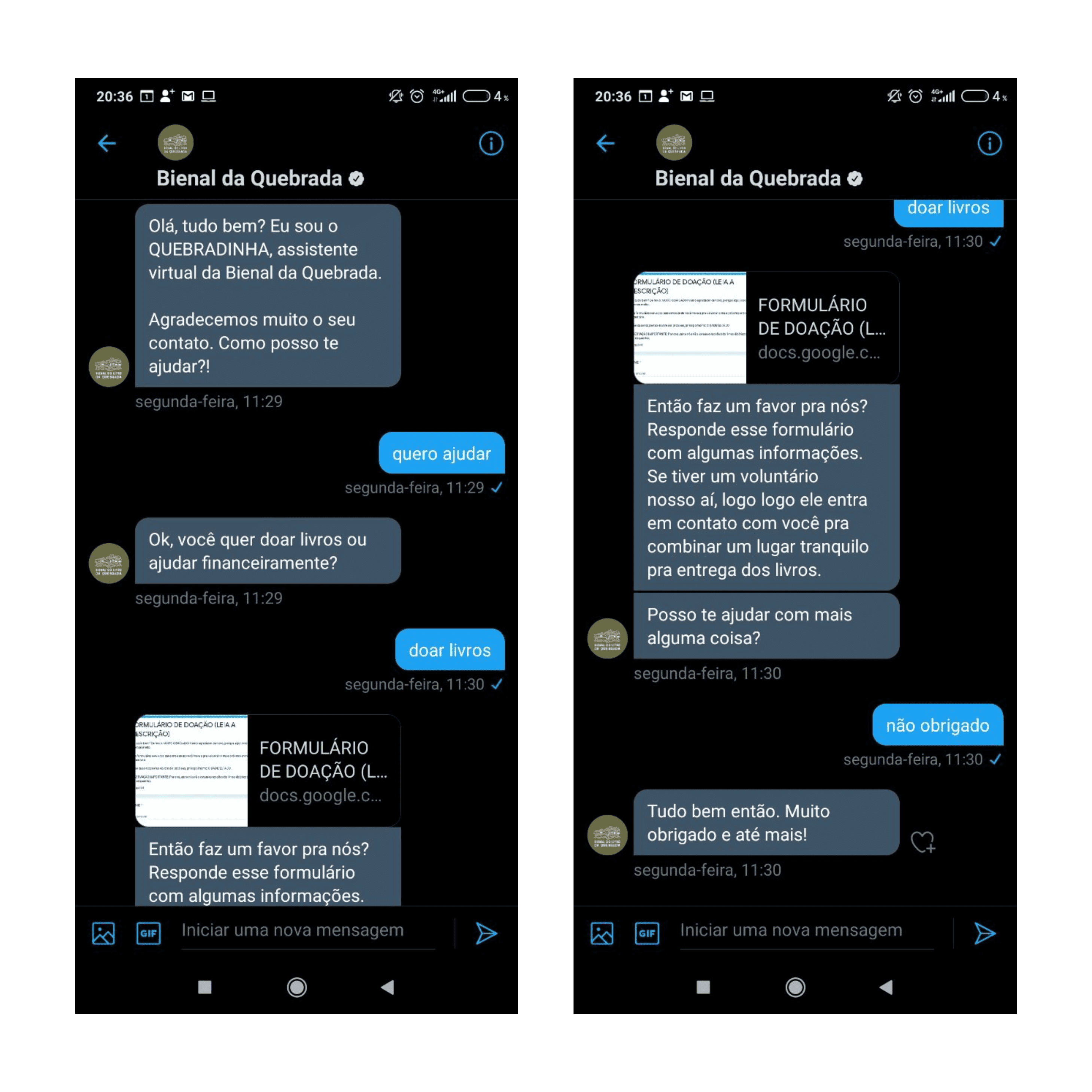 Felizmente a Bienal recebe várias solicitações de pessoas querendo doar livros, então o criador do movimento, @alamoju me chamou e perguntou se seria possível automatizar um pouco o processo de doações via DM do Twitter.
