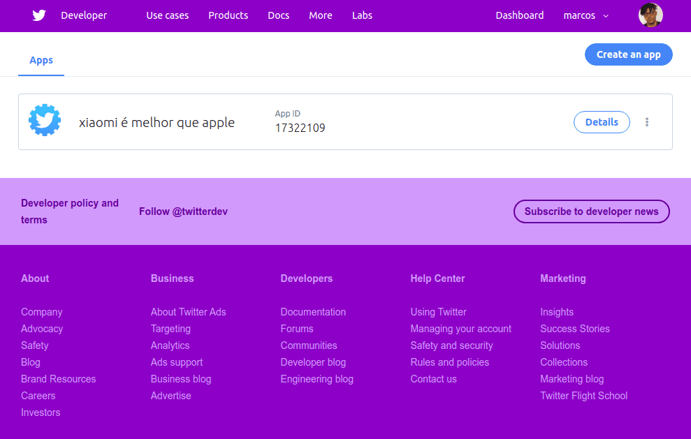 O primeiro passo foi solicitar acesso a uma conta de desenvolvimento no Twitter. Essa parte é fácil mas um pouco chata. Respondi os questionários até o final.