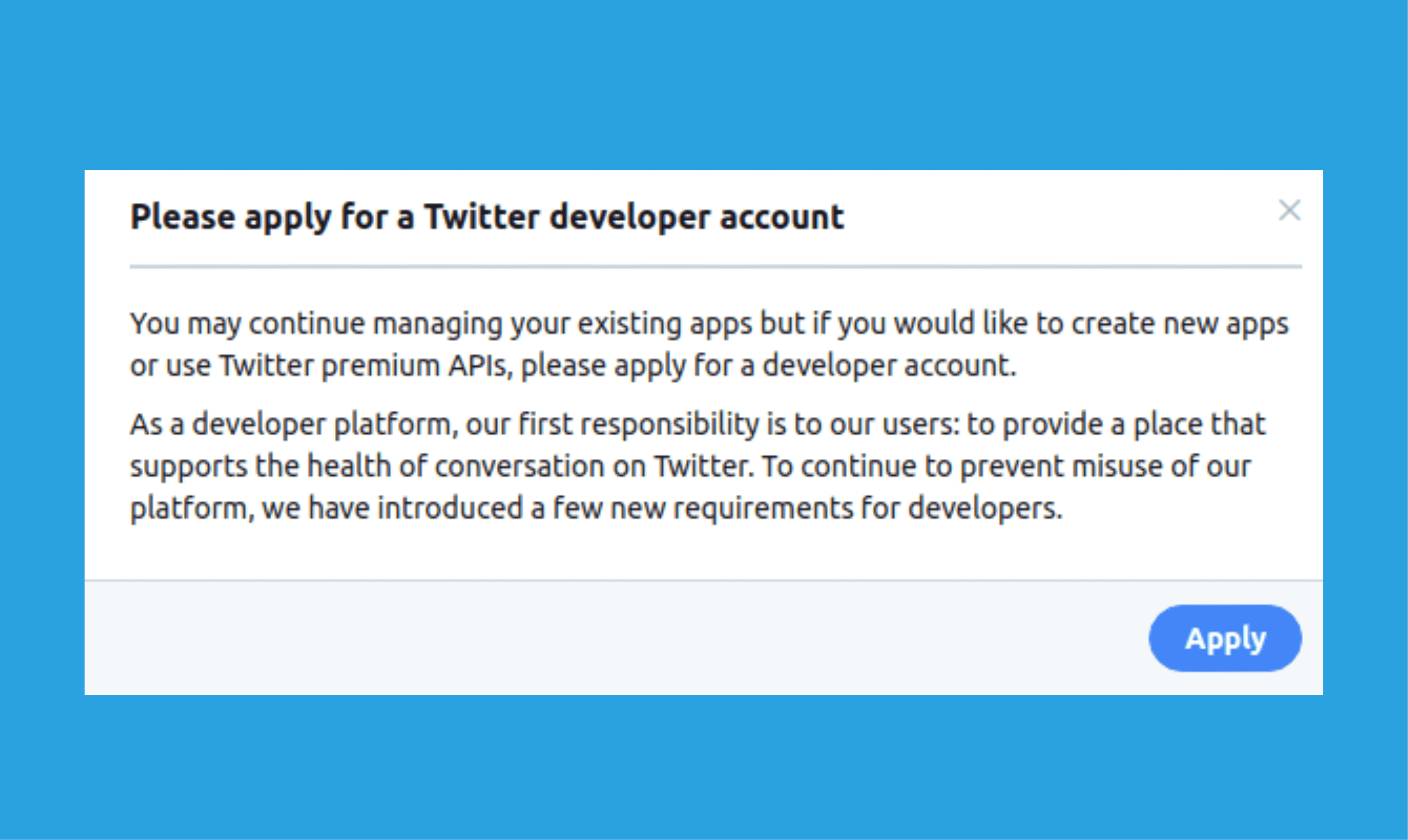 Apenas contas de desenvolvimento no Twitter podem criar APPS. Essas contas são, perfils normais do Twitter, que fizeram a solicitação para o modo de desenvolvimento.